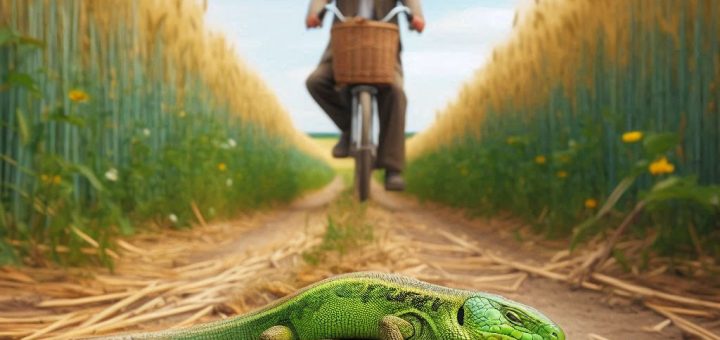Egyikük zöld, másik barna. Kiszaladtak a földútra. Játszadoztak, futkároztak, És amikor elfáradtak Poros úton elaludtak. Arra jött az öreg Jóska. Kerékpárja sárhányója Hangos, zörög, mégsem hallja Mélyen alvó két gyikocska. Egyiküknek kicsi farka Ott...