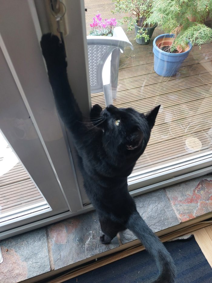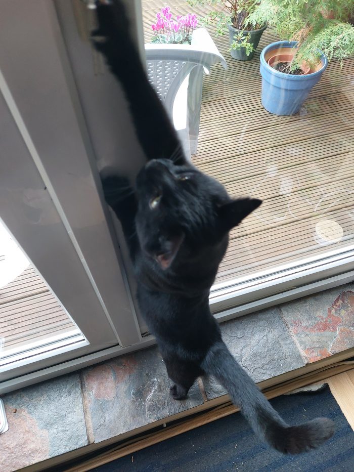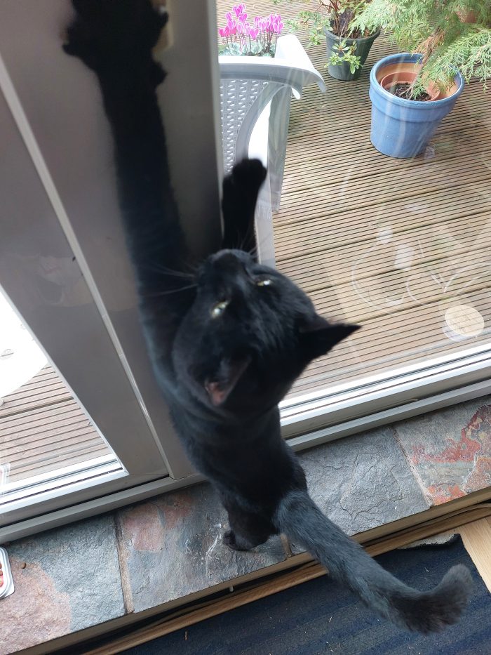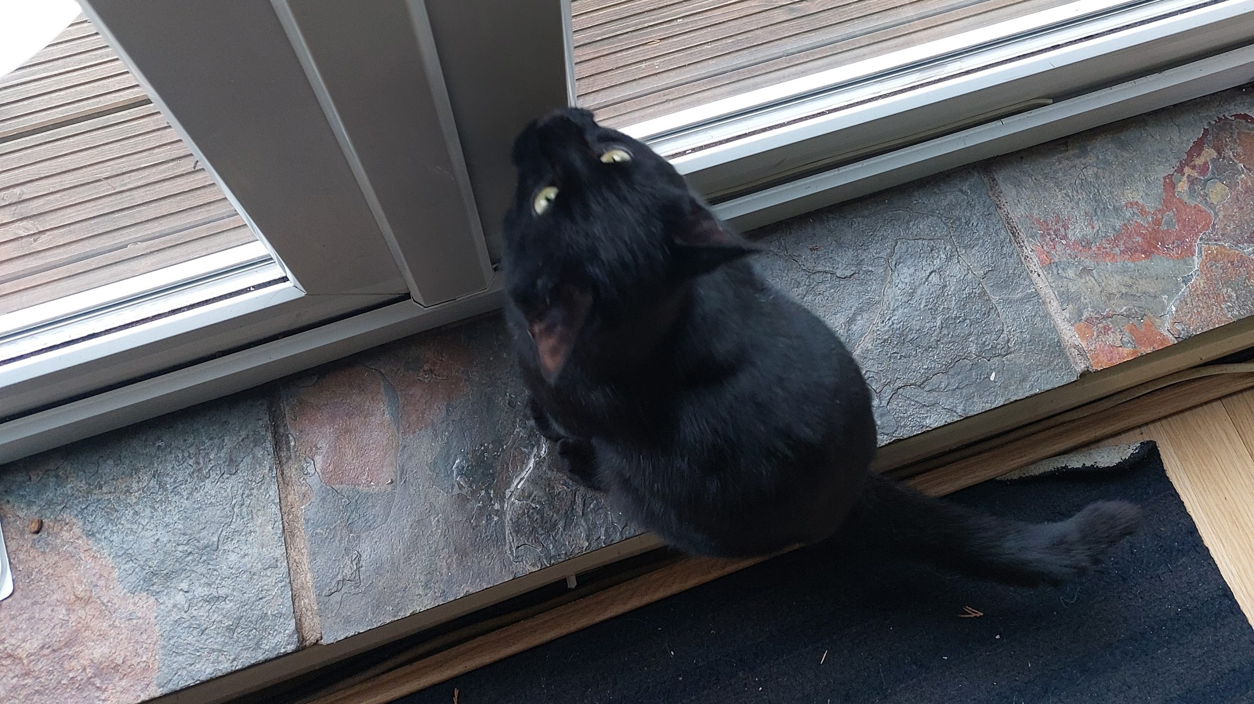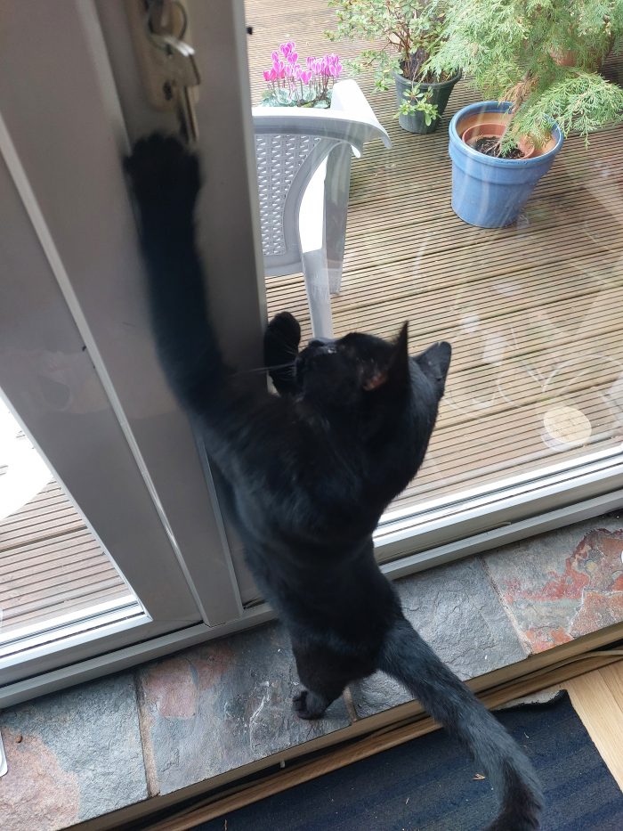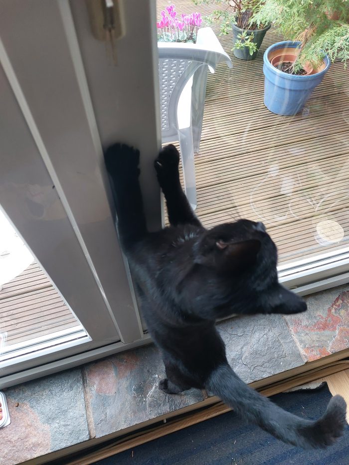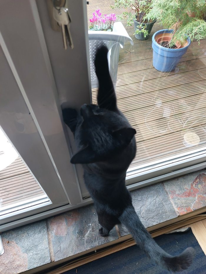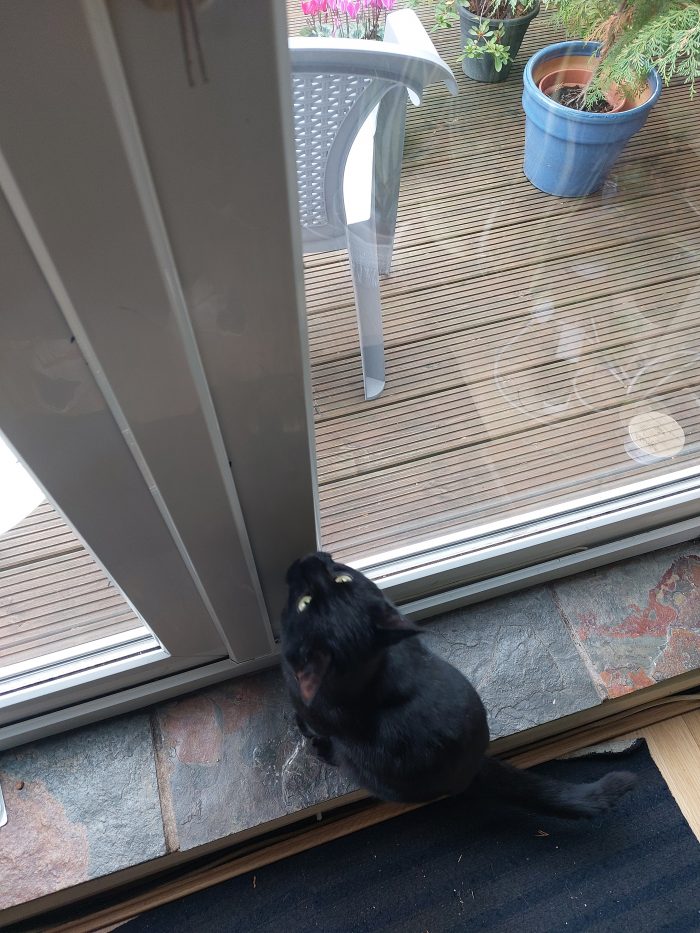 Szép csütörtöki napot kívánok Mindenkinek. Ma nem versben mesélek. Kis udvarunk majdnem fele terasz. Telehordta ismét a szél falevéllel. Fiam míg söprögette, a kis vörösbegy követte, magyarázott, mit hogyan kell elvégezni. De most mégsem róluk, a kóbor Kormiról mesélek. Megjött, hangosan kérte a kaját. Eszegetett, egyszer csak meglátta, hogy egy poloska mászik a közelében. Gondolom a nyitott ajtón bejött. Nézte-nézte, majd rám nézett, mintha kérte volna, dobd már ki ezt a betolakodót. Így is történt, kitessékeltük. Ismét eszegetett, amikor egy szem barna színű tápot meglátott, megrettent, azt hitte ismét egy bogár. Valahol ez a cica olyan helyen élhetett, ahol talán sok gyerek nyúvasztotta, mert ahogy jól lakik, kicsit simogattatja magát, majd nézi a kilincset, később föl is nyul, közli, szeretne elmenni. Erről készült a kép.